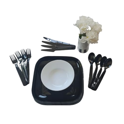 - طقم متين: تتضمن مجموعة أدوات المائدة البلاستيكية شديدة التحمل 4 أطباق و12 قطعة من الشوك والسكاكين والملاعق القابلة لإعادة الاستخدام.