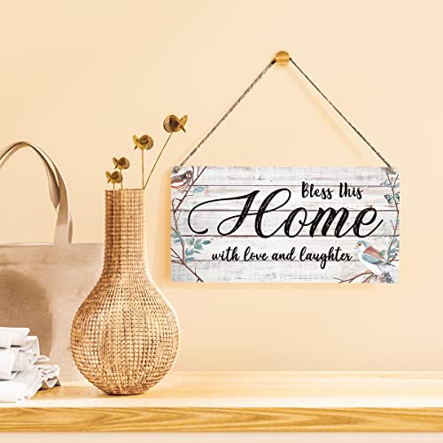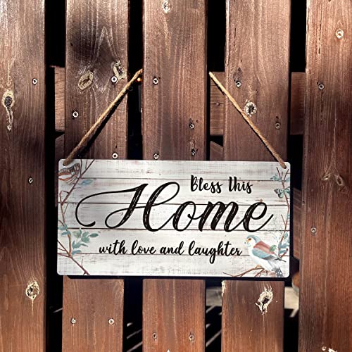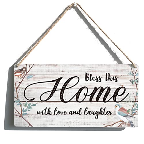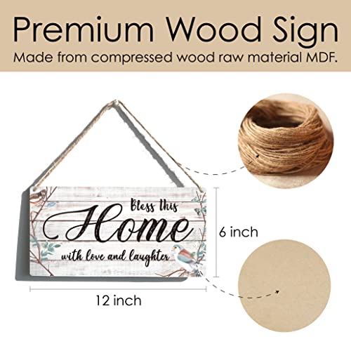 Qious - لافتة من الخشب قابلة للتعليق لديكور المنزل بتصميم ريفي عتيق وطباعة عبارة "Bless This Home with Love and Laughter" مقاس 12×6 بوصة