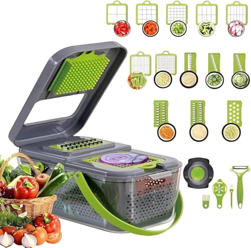 - توفر قطاعة الخضروات اليدوية هذه 22 وظيفة متعددة الاستخدامات في جهاز واحد مضغوط، بما في ذلك 13 شفرة قابلة للتبديل ومقشرة إضافية، مما يتيح تقطيع الخضروات وتقطيعها وبشرها بدقة مثل البصل والجزر والبطاطس والطماطم وحتى الجبن الصلب أو البيض المسلوق مع خيارات سمك قابلة للتعديل.