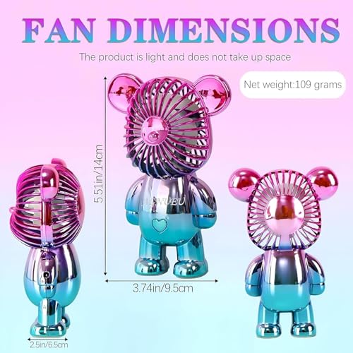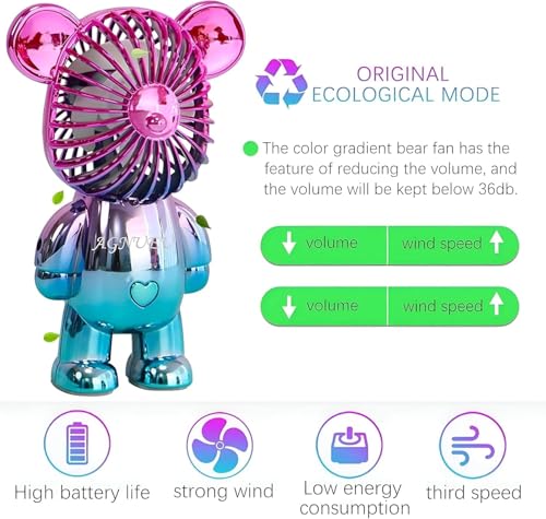 - تتميز المروحة المحمولة بتصميم دب متدرج ملون فريد، مما يجعلها ليست عملية فحسب، بل جذابة أيضًا بصريًا. مزود ببطارية قابلة لإعادة الشحن بمنفذ USB بسعة 400 مللي امبير في الساعة، مما يسمح بوقت شحن سريع لمدة 20 دقيقة. بمجرد شحنها بالكامل، يمكن للمروحة أن تعمل بشكل مستمر لمدة تصل إلى ساعتين، مما يوفر حل تبريد موثوق لمختلف المواقف، سواء في الداخل أو الخارج.