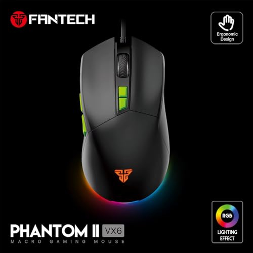 Generic - ماوس ألعاب USB Fan.tech VX6 Phantom II – دقة 7200 DPI فائقة الدقة، أزرار قابلة للبرمجة لتخصيص كامل، تصميم مريح للتحكم السريع، إضاءة RGB مميزة، أسود