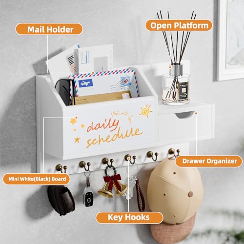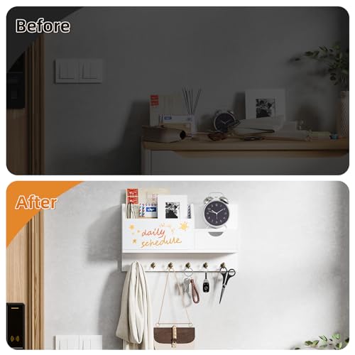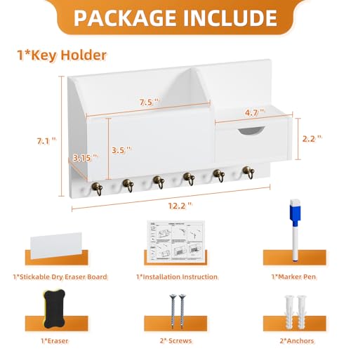 - 【حامل مفاتيح مطور】مجموعة رفوف المدخل المثبتة على الحائط هذه مكونة من 6 خطافات للمفاتيح، ومنظم بريد، ومنظم درج، ومنصة مفتوحة، ولوحة ممحاة جافة قابلة للالتصاق، وقلم ومسح. تحتوي على مساحة تخزين كافية لحمل ملحقات منزلك وتسمح لك بإبقاء جميع أغراضك الصغيرة في متناول اليد.