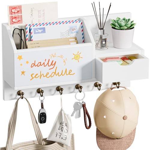 fanado - حامل مفاتيح خشبي يثبت على الحائط من فانادو للمفاتيح والبريد مع درج منظم بريد وخطافات رف لديكور المنزل وغرفة المعيشة ابيض