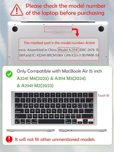 - [ملاحظة]: الجراب متوافق فقط مع ✔ ماك بوك اير 15 بوصة إصدار 2023 شريحة ام 2 مع شاشة ليكويد ريتينا وخاصية التعرف باللمس (رقم الموديل: A2941). ⚠ يرجى التحقق من رقم الطراز"Axxxx" على ظهر اللاب توب قبل الشراء. تأكد من اختيار نفس رقم الموديل الموضح في العنوان "A2941" أو"A2442"*** بدون قطع الشعار***