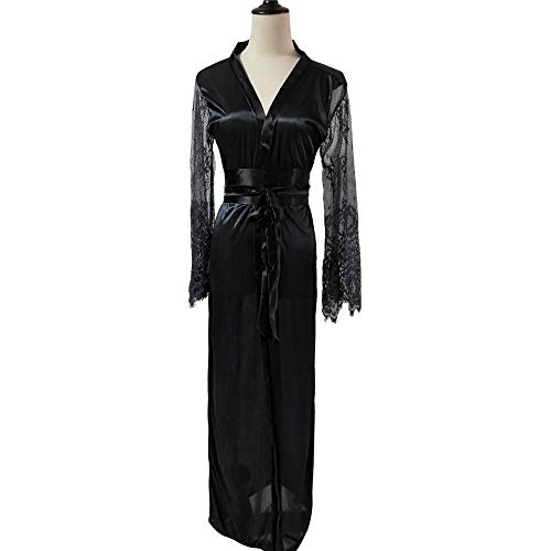 Generic - قميص نوم طويل مثير للنساء من الساتان مزين بالدانتيل مع حزام من فانكل, أسود, S