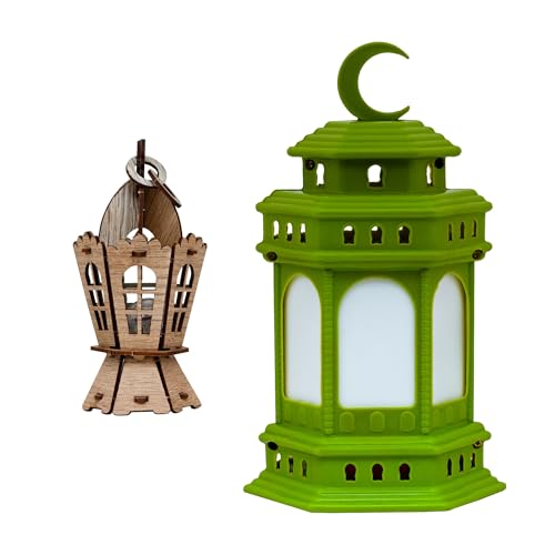 Generic - عروض رمضان من فنوني - فانوس بلاستيك جميل مقاس 25 سنتي اغاني وانوار + فانوس رمضان خشب 14 سنتي مضئ عند الحركة والهز (موديل 2)