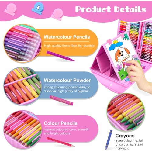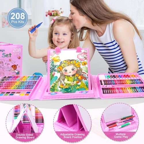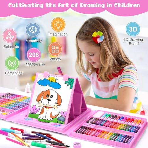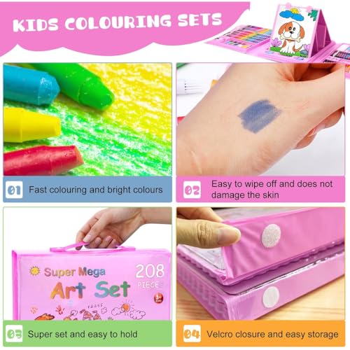 Generic - لوازم فنية للأطفال والمراهقين فانتاستيك كيدز مجموعة رسم ثلاثية القوائم تتضمن ألوان زيت باستيل وألوان شمع خشب وردي 208 قطعة