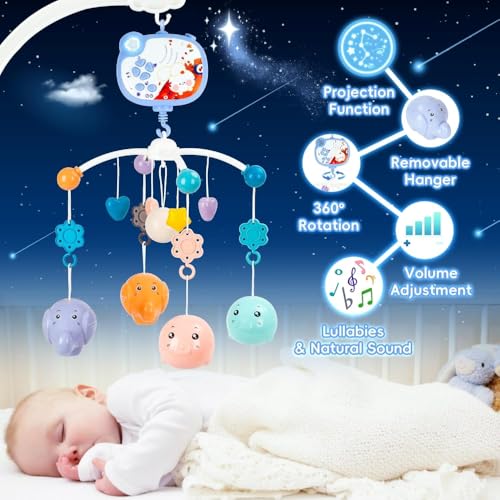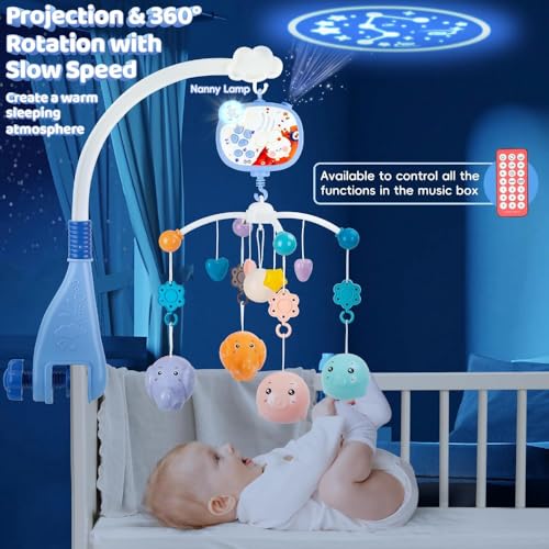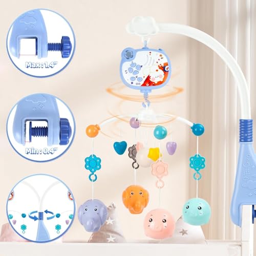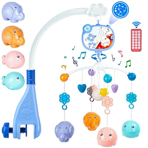 LC - لعبة متنقلة موسيقية للأطفال فانتاستيك تويز مع جهاز عرض ووظيفة توقيت أضواء وخشخيشة دوارة معلقة، جهاز تحكم عن بعد، ألعاب سرير حديثي الولادة للأطفال من سن الولادة فما فوق 668-16، لون أزرق