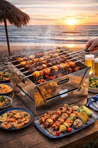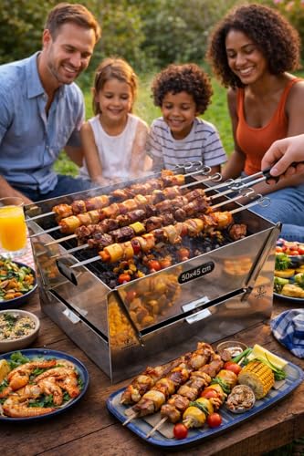 Generic - شواية فحم خارجية محمولة من الفولاذ مقاوم للصدأ 304 بنسبة 100%، سمك 2 ملم، 50×45 سم، 12 كجم - تتضمن 8 أسياخ من الفولاذ المقاوم للصدأ