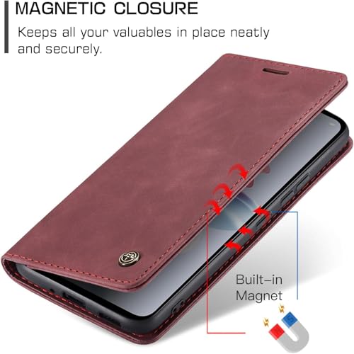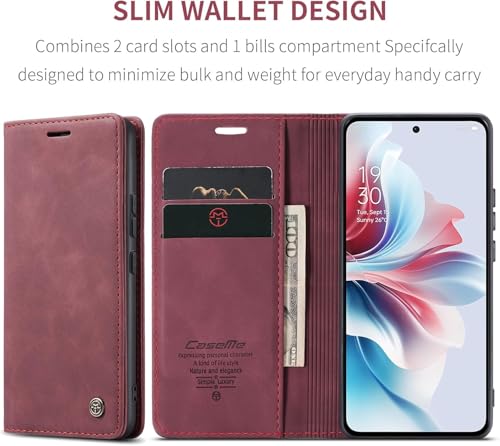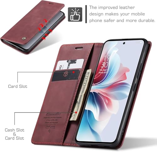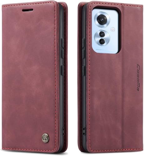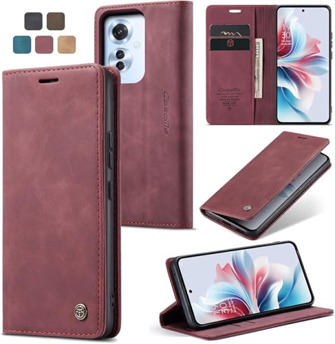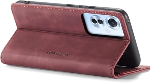 FASCINATION - جراب موبايل متوافق مع اوبو رينو 11F شبكة الجيل الخامس 5G جلد افقي متعدد الوظائف فتحة للبطاقات وحامل ومحفظة لموبايل 11F 5G احمر نبيذي منقلب