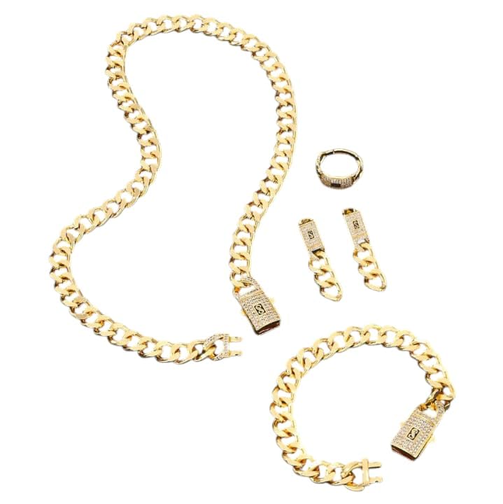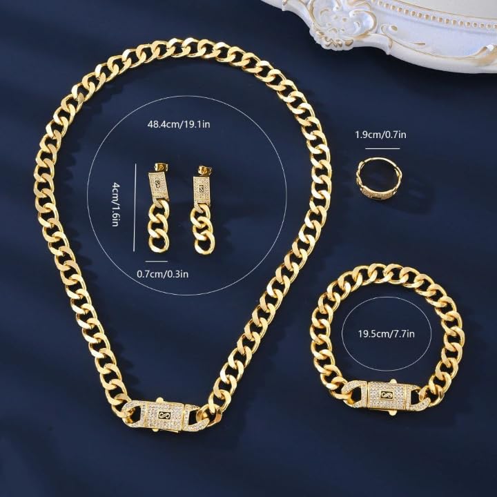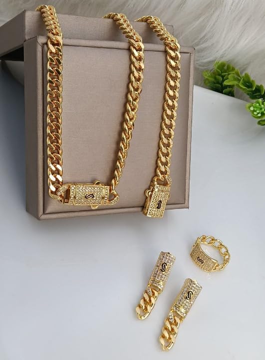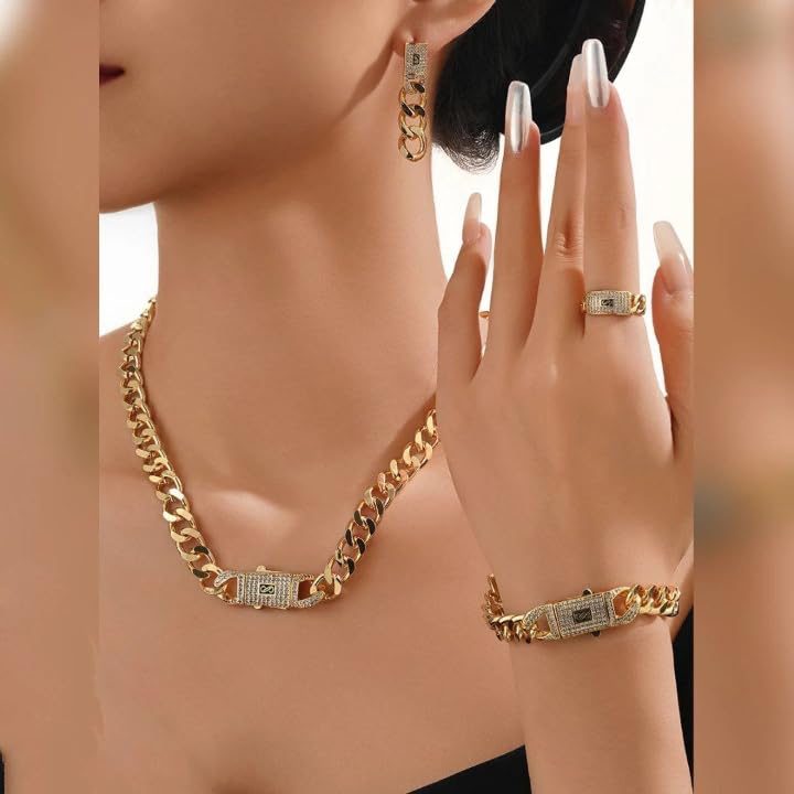 Generic - طقم قلادة وحلق وانسيال وخاتم عصرية من الستانلس ستيل المطلي بالذهب عيار 18 قيراط بتصميم حبل سميك بطول 6 ملم و60 سم للاولاد والنساء ،