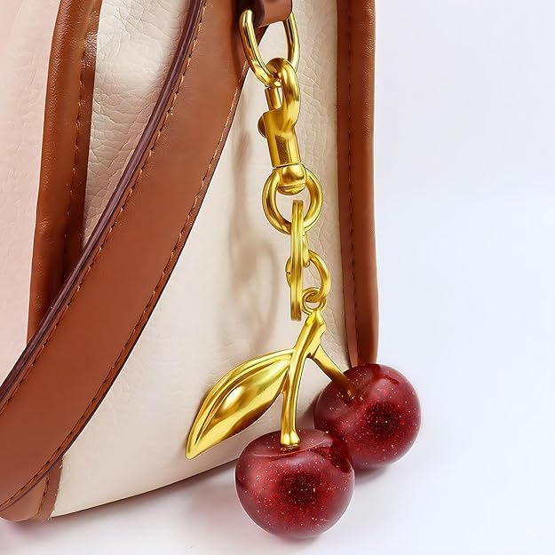 Generic - ميدالية مفاتيح و شنطة بتصميم كرزة عصرية | حلقة مفاتيح وإكسسوار شنطة يد للبنات والنساء | تعليقة جذابة مطلية بالذهب بتفاصيل حمراء لامعة ورائعة
