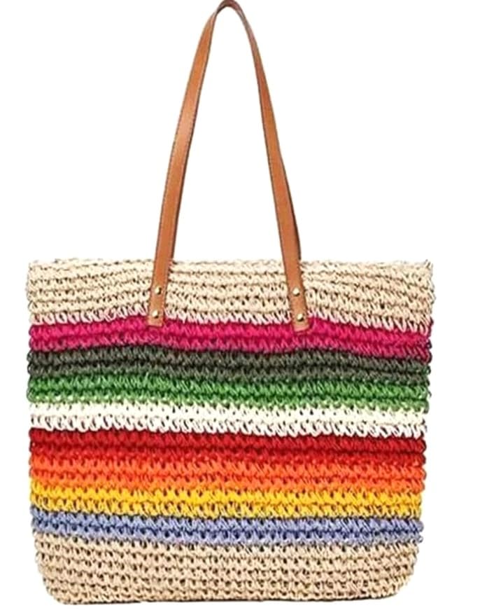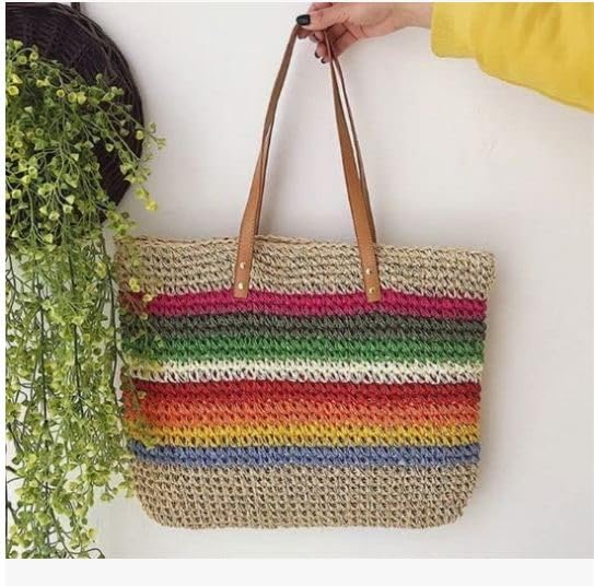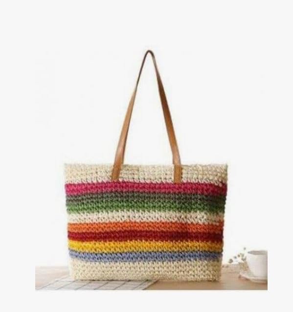 Generic - شنطة كروشيه ملونة أنيقة للبنات -حقائب كتف توتس للشاطىء للنساء - يد جلد قوية مقاس 65سم