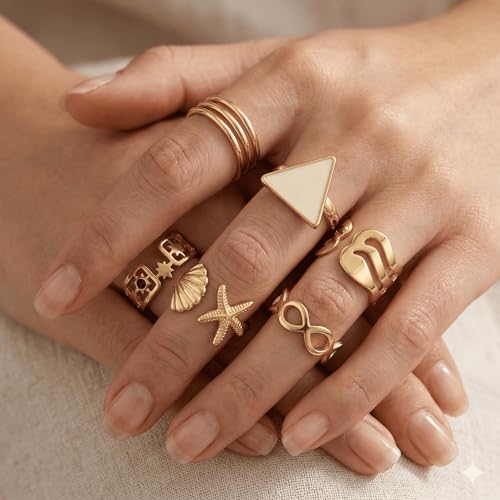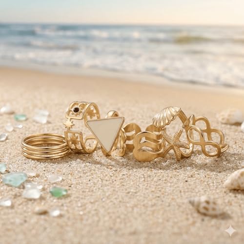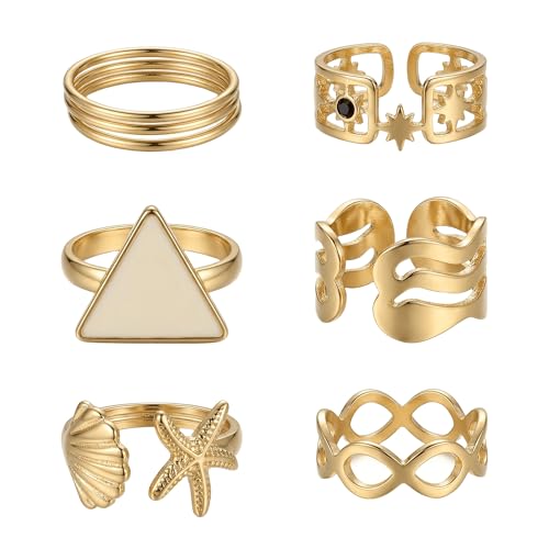 Generic - طقم خواتم ذهبية عصرية مكون من 6 قطع | تصاميم بوهيمية وسماوية (شمس، صدف، إنفينيتي، مثلث) | خواتم نسائية قابلة للتعديل ومطلية بالذهب | هدية مثالية وأنيقة مقاوم للصدأ والبهتان