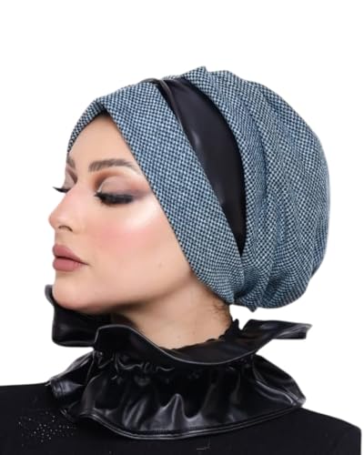 Generic - حجاب عصري نسائي، قماش منقوش باللون الجراي والأسود، غطاء رأس أنيق مع شريط جلدي، تصميم عملي للحجاب اليومي