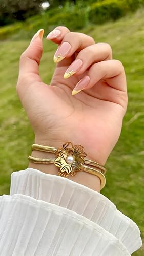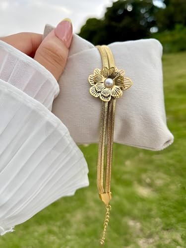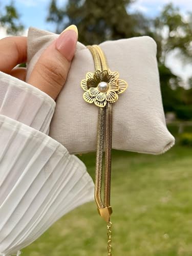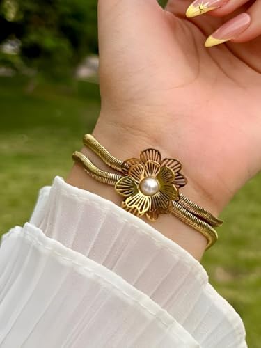 Generic - مجوهرات عصرية - اساور بتصميم زهرة من اللؤلؤ الذهبي تتميز بسلسلة مزدوجة كلاسيكية بنمط ثعبان لمظهر انيق للنساء