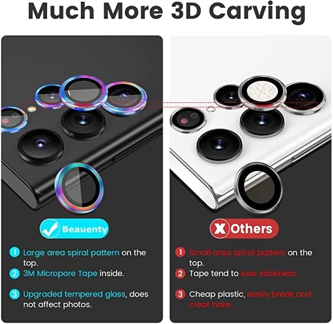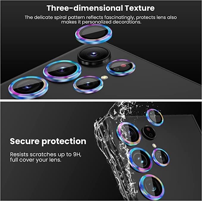 - نسيج ثلاثي الأبعاد - ينتج النمط الحلزوني الدقيق والدقيق لواقي دي كامارا سامسونج اس 22 الترا انعكاسات رائعة ولمعانًا لا مثيل له في أي ضوء، مما يحمي عدساتك مع جعلها ديكورًا شخصيًا. حلقة واقية للعدسات متعددة الألوان تناسب ذوقك.