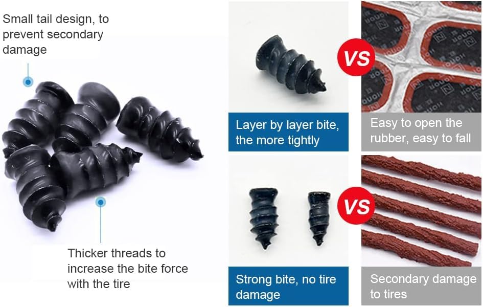 - 【مطاط متين】مسامير إصلاح الإطارات ذاتية الخدمة الخاصة بنا مصنوعة من مادة مطاطية عالية الجودة، مقاومة للتآكل ومقاومة لدرجات الحرارة العالية. يمكنها إصلاح الإطارات التالفة بسرعة دون التسبب في تلفها.