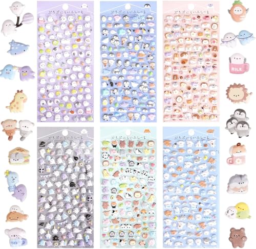fashion mania - مجموعة ستيكر صغير منتفخة لطيفة 600+ قطعة - للأطفال والفتيات والكبار - شخصيات كرتونية يابانية كاوايي مثل الأشباح والحيوانات والقطط والكلاب والبطاريق والطيور لجراب الموبايل - قابلة للإزالة - 6 أوراق