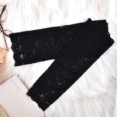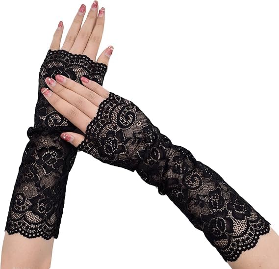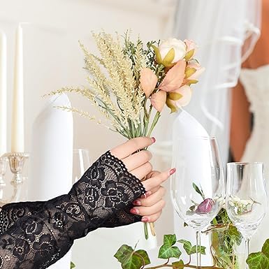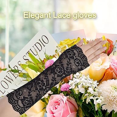 fashion mania - قفازات دانتيل بدون اصابع بنمط زهور سوداء بطول الكوع من فاشون مانيا، اكسسوارات حفلات الزفاف والسهرات، مقاس واحد
