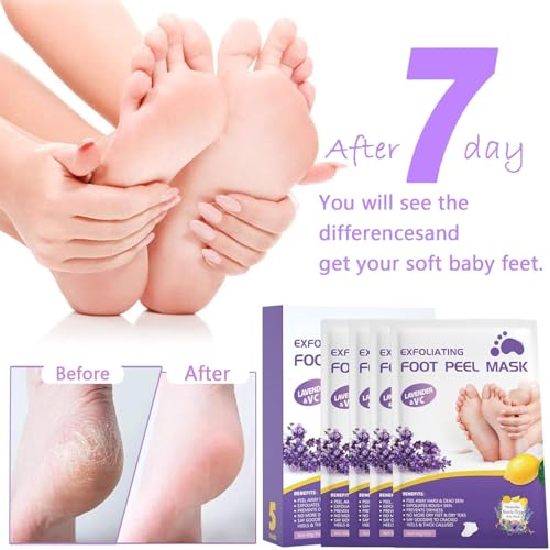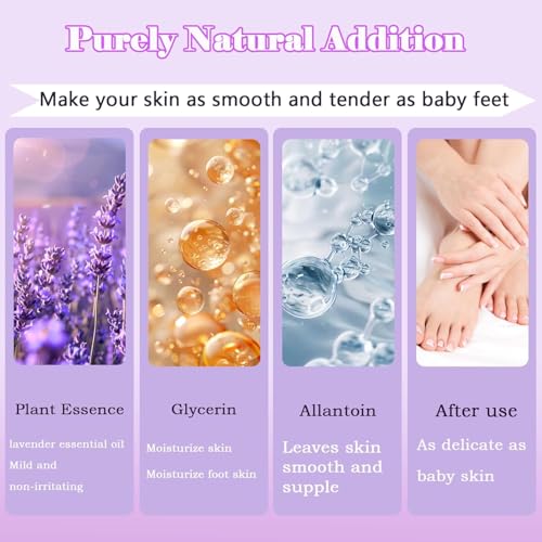 - [تقشير فعال]: تمت إضافة جوارب تنعيم القدم بخلاصة اللافندر وحمض الهيالورونيك وفيتامين E لتوفير ترطيب عميق ومغذي وإصلاح احترافي، بعيدًا عن الجفاف والتشققات.