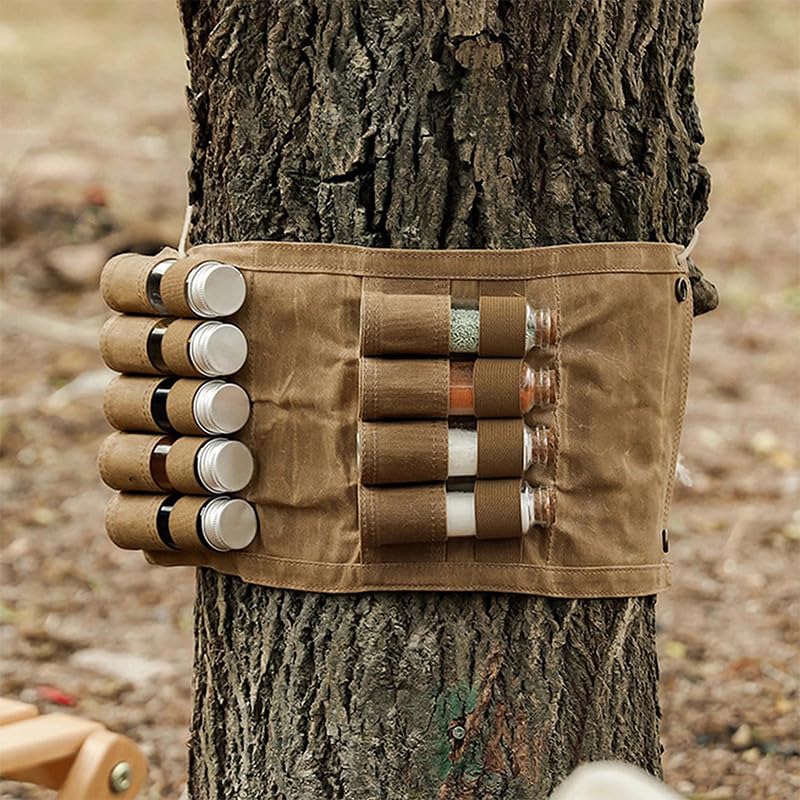 - [تصميم فريد للاستخدام في الهواء الطلق] حقيبة تخزين زجاجة التوابل، تصميم قابل للطي، صغيرة الحجم وسهلة الحمل، يمكن أن تزيد من متعة الطبخ لعشاق الهواء الطلق. يمكن تثبيت كيس التوابل هذا بأمان على الشجرة وهو مريح للغاية في الاستخدام.
