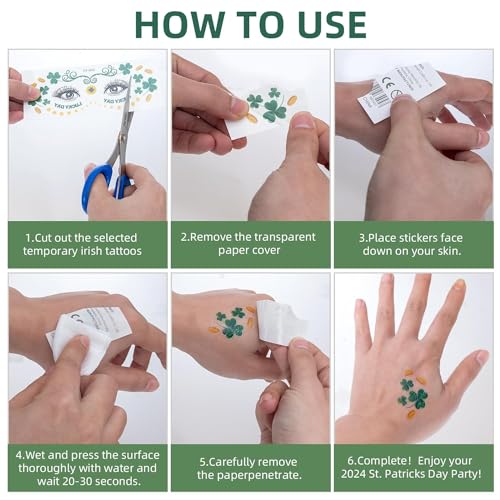 - ☘️【سهل التركيب والإزالة】يتميز تاتو شامروك المقاوم للماء والعرق بالتصاق جيد وسيبقى ثابتًا طوال الليل. التعليمات المرفقة سهلة الاتباع (استخدام اللغة العربية غير مؤكد). لإزالة التاتو بسرعة، استخدم زيت الأطفال أو زيت جوز الهند أو زيت الزيتون. ببساطة ضع الزيت على التاتو وافركه. إنه سهل للغاية!