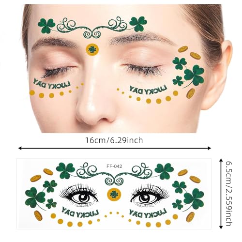 - ☘️【تصميم لطيف تاتو مكياج لعيد القديس باتريك للنساء والرجال】 تاتو مؤقت بتصميم وجه نبات النفل اللامع لعيد القديس باتريك بتصميم لعام 2024، سيجعلك بالتأكيد مميزًا في حفلتك ذات الطابع الإيرلندي. منتج رائع للاستمتاع به. مجموعة مكياج الوجه يمكن لصق تاتو باتريك شامروك جيدًا على وجهك وعينك وجبهتك.