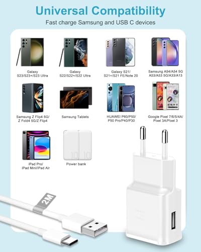 - شاحن USB بتقنية الشحن السريع وكابل USB نوع C بطول 2 متر، التوافق: شاحن USB بتقنية الشحن السريع بقدرة 15 وات وكابل USB نوع C متوافق مع سامسونج جالاكسي A04s، A05s، A13 ،A14 شبكة الجيل الرابع (4G)/ شبكة الجيل الخامس (5G) A20، A20E، A21A، A21S، A22، A23، A32، A34، A50، A51، A52، A52S، A53. A70، A70S، A71، A80، A90، S8، S9، S10e، S10 بلس، S20، S20+، S20 اف اي، S20 الترا شبكة الجيل الخامس 5G ، S21، S22، نوت 8، نوت 9، نوت 10، نوت 20، زد Fold2 5G، Fold3، Fold4، Fold5، زد Flip2 Lip3، Flip3، Flip4، Flip5، ولأجهزة شاومي ريدمي نوت 9، 9 برو، 9S، 8، 7 برو، 10، 10s، 10 برو، 11، ولأجهزة جوجل بكسل 2، بكسل 3، بكسل اكس ال، بكسل 2XL، بكسل 3XL، بكسل 3A، وكافة الأجهزة التي تعمل بمنفذ USB نوع C.