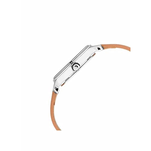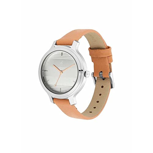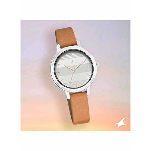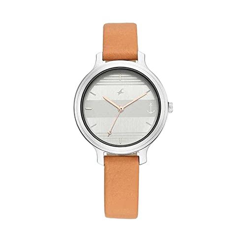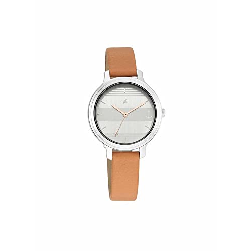 Titan - ساعة تريبستر تيتان أنالوج بعقارب ومينا مخطط وسوار جلد للنساء من فاست تراك - جملي وفضي