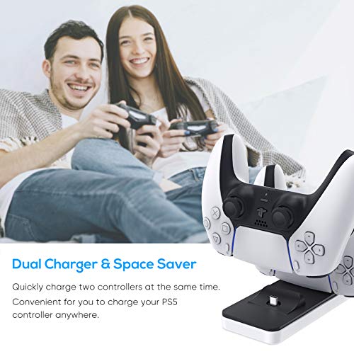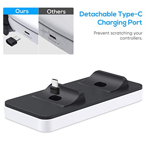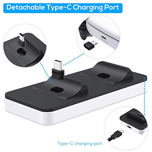 - شاحن مزدوج: تم تصميم قاعدة الشحن هذه خصيصًا لوحدة تحكم بلاي ستيشن 5، ويمكنها شحن وحدتي تحكم في وقت واحد باستخدام محول من النوع سي، والذي يسهل إدخاله أو سحبه من شحن وحدة التحكم، ويحمي بفعالية واجهة شحن وحدة التحكم من التآكل