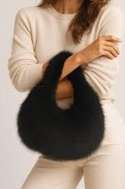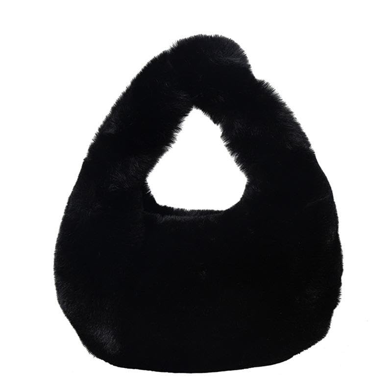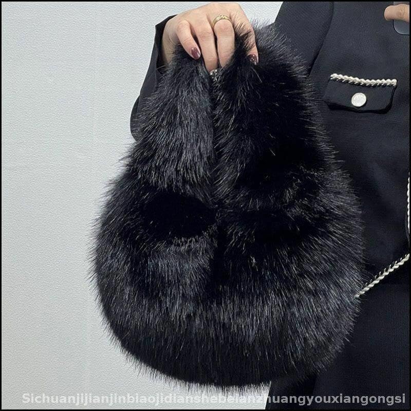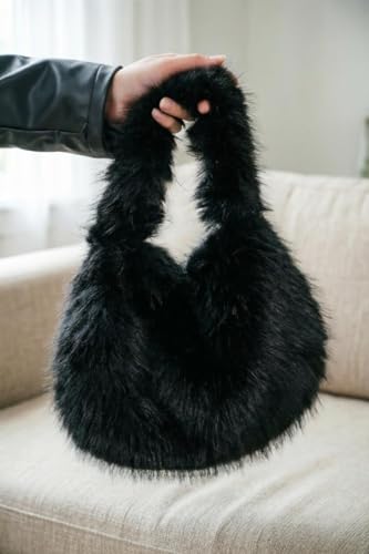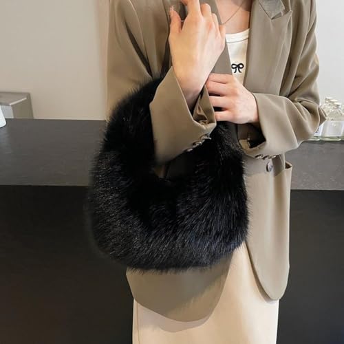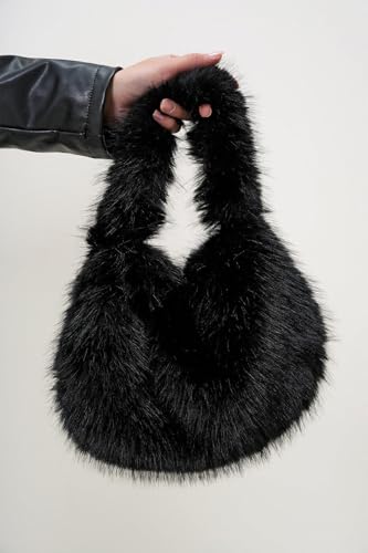 Generic - شنطة هوبو من الفرو الصناعي - شنطة كتف هوبو مخملية فاخرة بلون اسود منفوش مع ملمس ناعم، اكسسوار عصري شتوي مثالي للايام الباردة ونمط حضري أنيق.