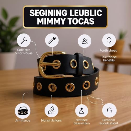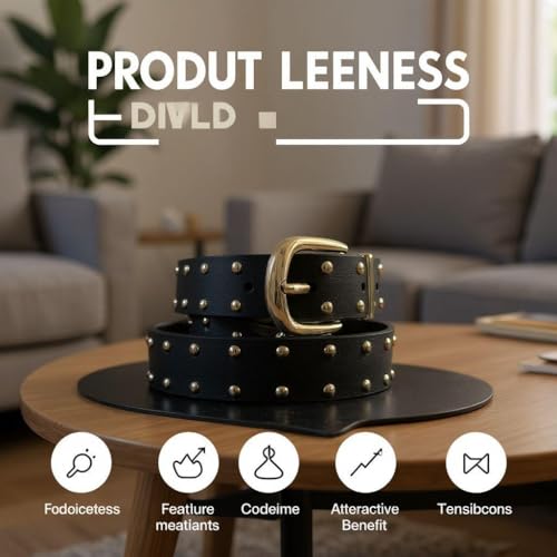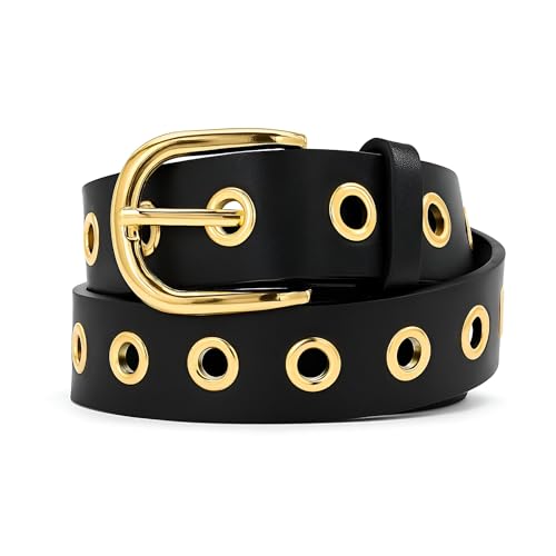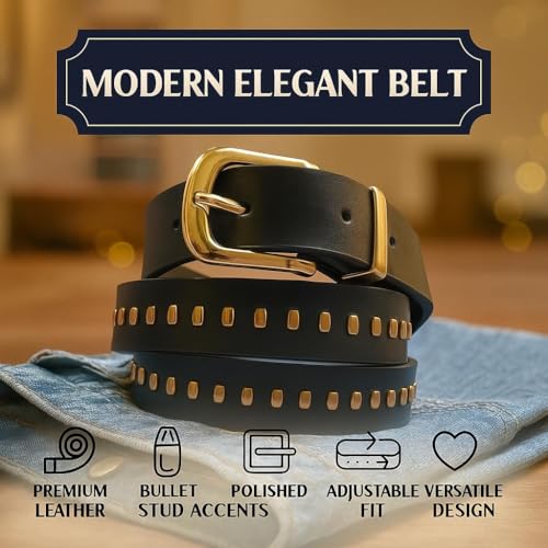 Generic - حزام من الجلد الصناعي - تصميم عصري أنيق مع حلقات ذهبية، حزام اسود قابل للتعديل يتميز بمسامير معدنية دائرية وابزيم للاغلاق للارتداء الكاجوال