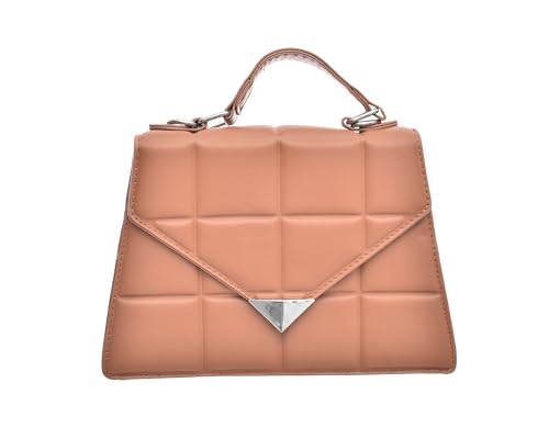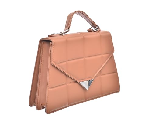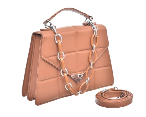 Generic - شنطة يد متوسطة الحجم من الجلد الصناعي مقسمة من الداخل بتصميم مربعات بارزة تحتوي على حزام كتف طويل وحزام يد بسلسلة ومقبض قوي للنساء - لون بني