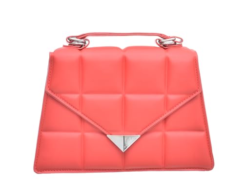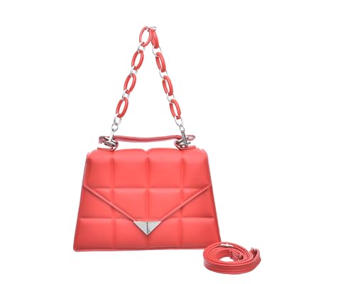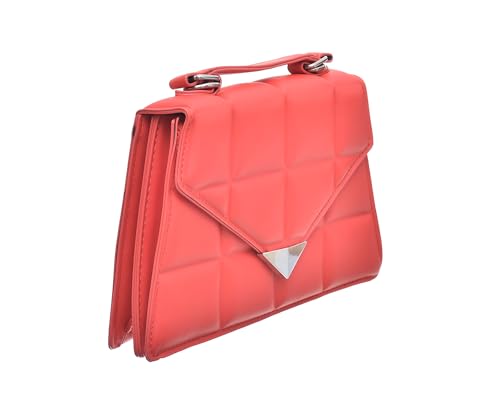 Generic - شنطة يد متوسطة الحجم من الجلد الصناعي مقسمة من الداخل بتصميم مربعات بارزة تحتوي على حزام كتف طويل وحزام يد بسلسلة ومقبض قوي للنساء - لون أحمر