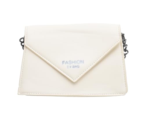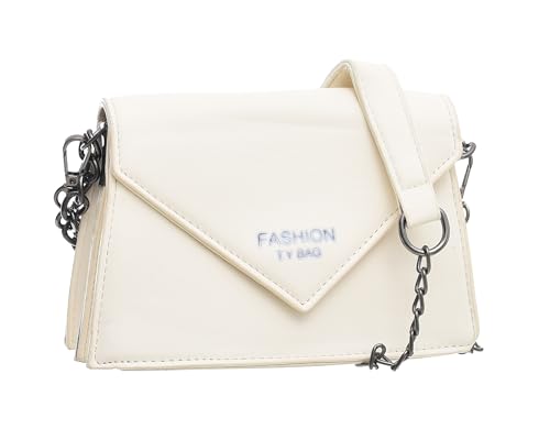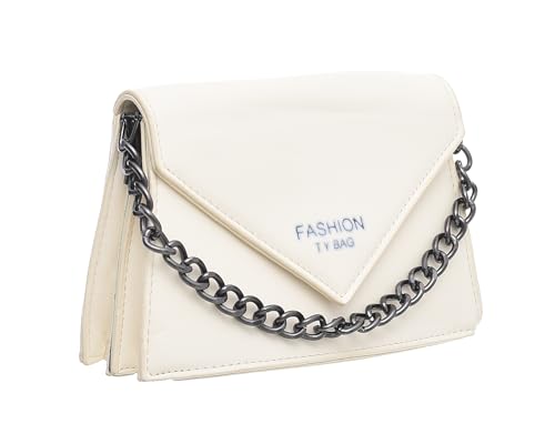 Generic - شنطة يد صغيرة من الجلد الصناعي بتصميم حديث مقسمة إلى جزأين الداخل مع حزام معدني طويل وسوستة للنساء - اوف وايت وأسود