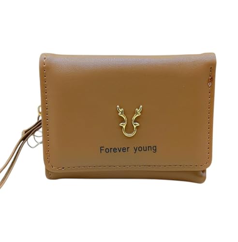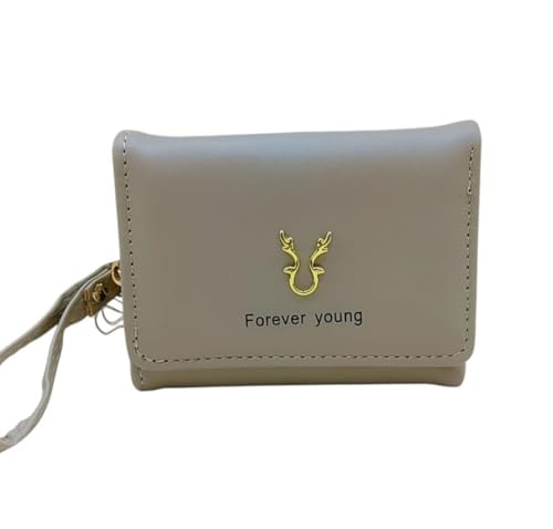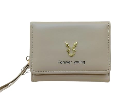 Generic - محفظة نسائية صغيرة من الجلد الصناعي، تصميم عصري مع شعار ذهبي وحزام معصم، متوفرة بألوان بيج وزهري وبني، للسيدات