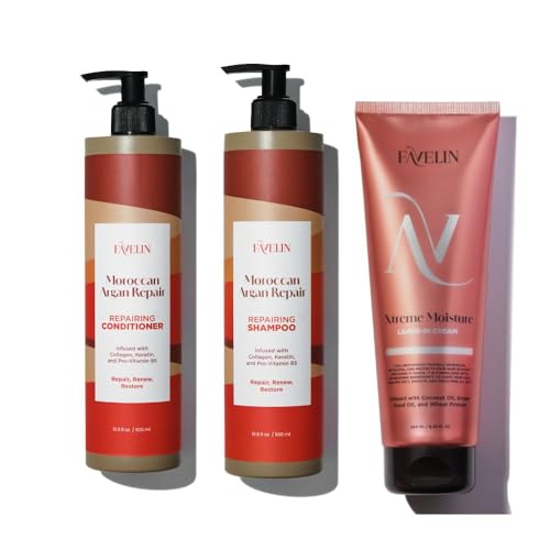 Favelin - منتجات علاج الشعر بزيت الأرجان المغربي تشمل شامبو 500 مل وبلسم 500 مل وليف ان كريم 250 مل لترطيب الشعر والتحكم في التجعد لكل خصلة وتنعيمها من فافلين
