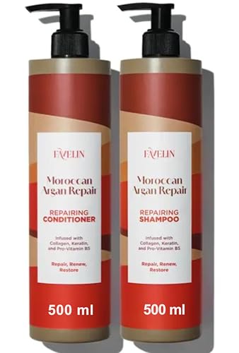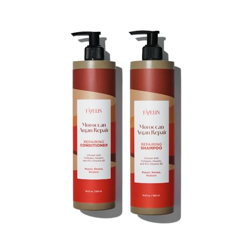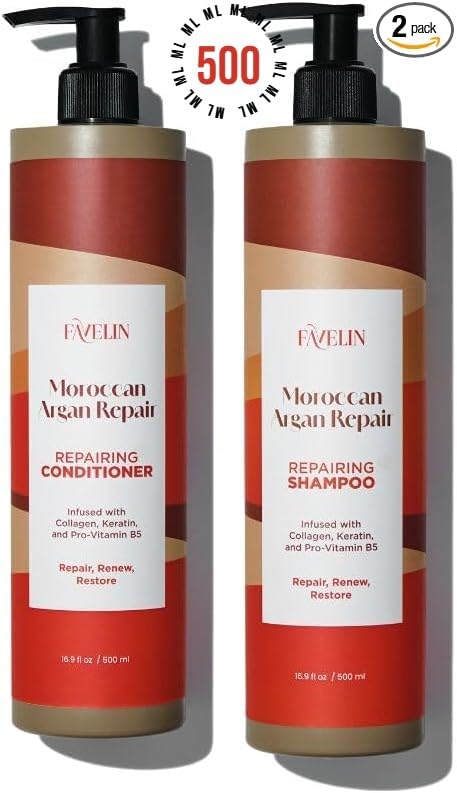Favelin - مجموعة إصلاح الشعر بالأرجان المغربي من فافلين، شامبو سعة 500 مل وبلسم 500 مل بالكيراتين وبروفيتامين لإصلاح مكثف لجميع أنواع تلف الشعر