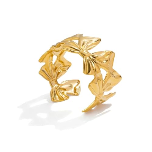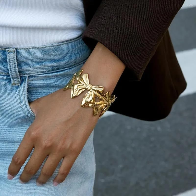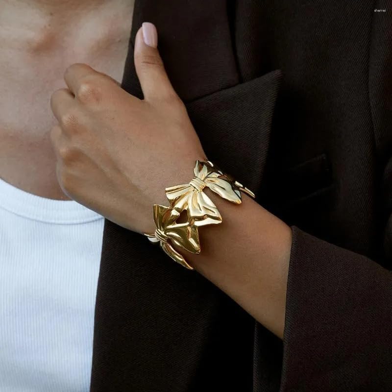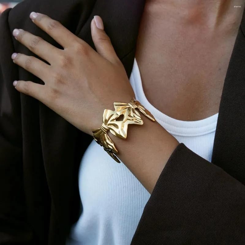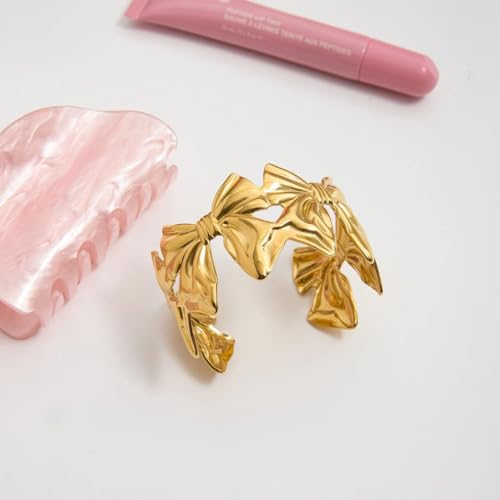 Fayrouz Jewellery - سوار العصري المفتوح على شكل فيونكة رائعة مصنوع من ستانلس ستيل مع طلاء ذهبي عيار 18 قيراطًا مقاوم للماء مناسب للارتداء اليومي للنساء . من فيروز جوليري.