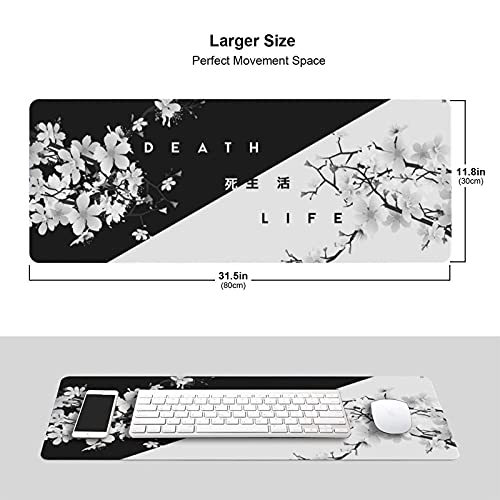 FDASLJ - لوحة ماوس كبيرة للألعاب بتصميم أزهار شجرة الكرز بنمط ياباني بلونين أسود وأبيض، مقاس كبير جدًا، لوحة ماوس طويلة بحواف مخيطة وقاعدة مطاطية مضادة للانزلاق من اف دي ايه اس ال جيه، مقاس 80×30 سم