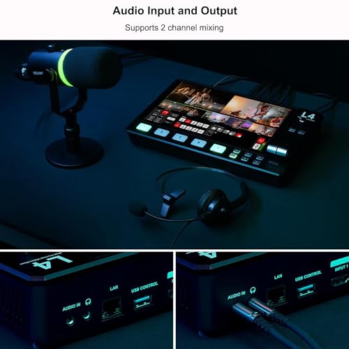 - 【يدعم مزج قناتين】مع مدخل صوت ستيريو 3.5 ملم، يمكنك توصيل الميكروفون بمحطة التبديل L4، ويمكن عرض جميع مدخلات الصوت في الوقت المناسب على الشاشة لفهم حالة الصوت بشكل أفضل. يوفر L4 أيضًا واجهة إخراج صوت قياسية 3.5 ملم، ويمكنك استخدام مكبر صوت خارجي أو سماعات رأس لمراقبة إشارة الصوت المخرجة الرئيسية لـ L4 في الوقت المناسب. بالإضافة إلى ذلك، يدعم L4 أيضًا المزج بقناتين