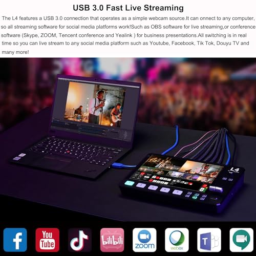 - 【مخرج HDMI وSDI】بالنسبة لبعض التطبيقات التي تحتاج إلى مراقبة متعددة الأشخاص، يمكنك استخدام كابل HDMI لتوصيل مخرج HDMI L4 بشاشة بواجهة إدخال HDMI حتى تتمكن من رؤية جميع الكاميرات وعدادات الصوت والمعاينة وإخراج البرنامج النهائي في وقت واحد، كل التبديل في الوقت الفعلي. يدعم مخرج HDMI إعداد الدقة، ويدعم حتى 1080 بيكسل/60. تم تجهيز L4 أيضًا بواجهة إخراج SDI، والتي يمكنها توصيل شاشة SDI الخارجية بإخراج إشارة PGM