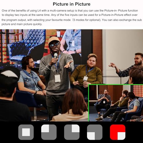 - 【الصورة داخل الصورة】تتمثل إحدى مزايا استخدام L4 مع إعداد الكاميرا المتعددة في أنه يمكنك استخدام وظيفة الصورة داخل الصورة لعرض مدخلين في نفس الوقت. يمكن استخدام أي من المدخلات الخمسة للحصول على تأثير صورة داخل صورة على إخراج البرنامج، مع اختيار الوضع المفضل لديك (5 أوضاع اختيارية). يمكنك أيضًا استبدال الصورة الفرعية والصورة الرئيسية بسرعة