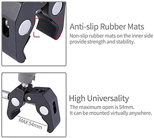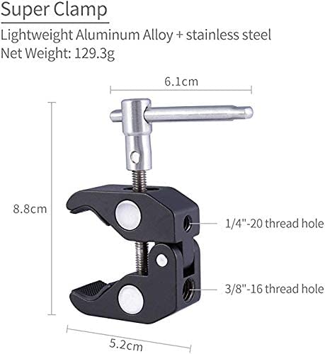 - 【إصلاح الملحقات بسهولة أكبر】تساعد مهندسي الإضاءة أو المصورين على إصلاح ملحقاتهم بسهولة أكبر. يحتوي المشبك الفائق على فتحة خيط 1/4 انش - 20 وفتحة خيط واحدة 3/8 انش - 16، يمكنك تحديد حجم المصباح اليدوي والشاشة وجهاز LCD وكاميرات دي اس ال ار وما إلى ذلك.