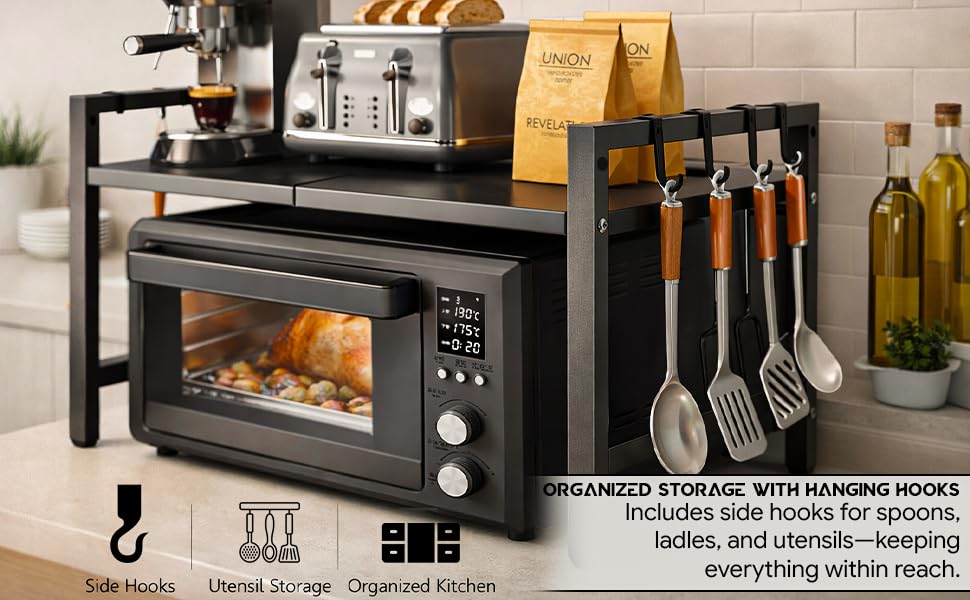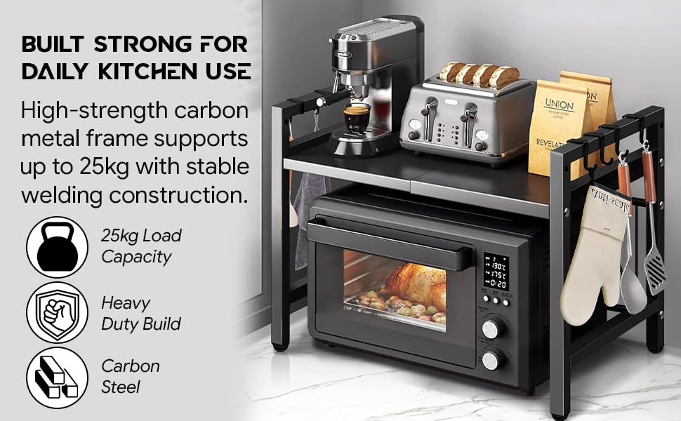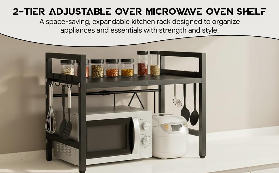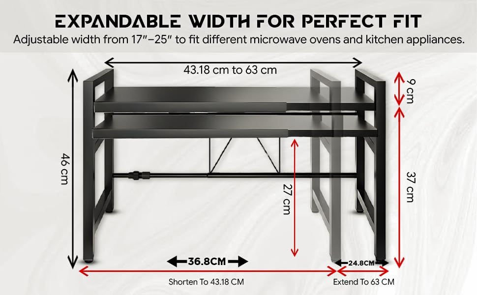 - 【تصميم قابل للتوسيع】يتراوح نطاق عرض التوسع لفرن الميكروويف بين 17 انش - 25 انش (العرض 43-63 سم)، والذي يمكن تعديله بحرية، ويمكن استخدامه في الأجهزة المنزلية الصغيرة الأخرى والأفران بأحجام مختلفة. كما أن قدرته على التحمل تسمح لك بوضع العديد من الأشياء عليه. يوفر الكثير من المساحة والوقت من خلال تسهيل الوصول إلى الأدوات واللوازم.