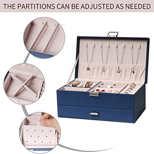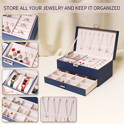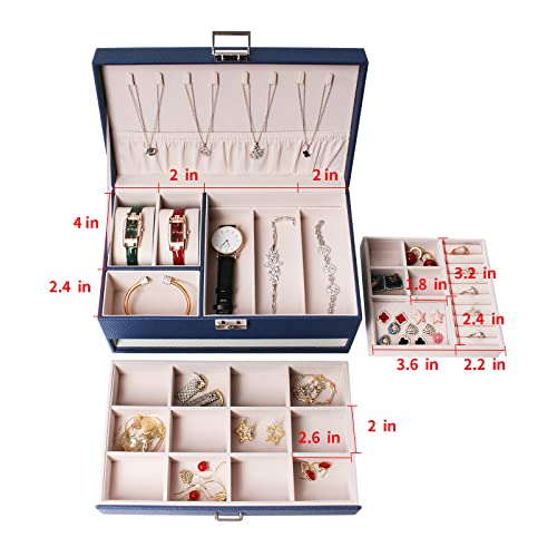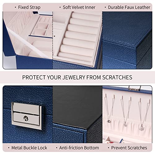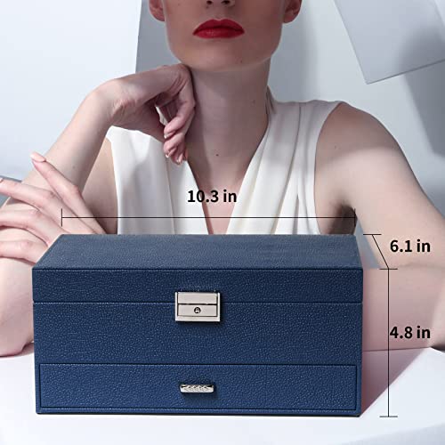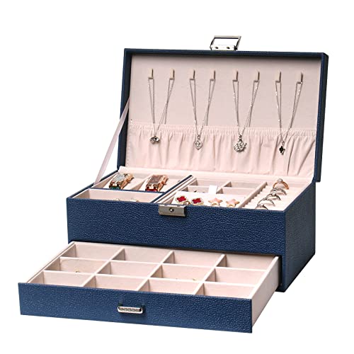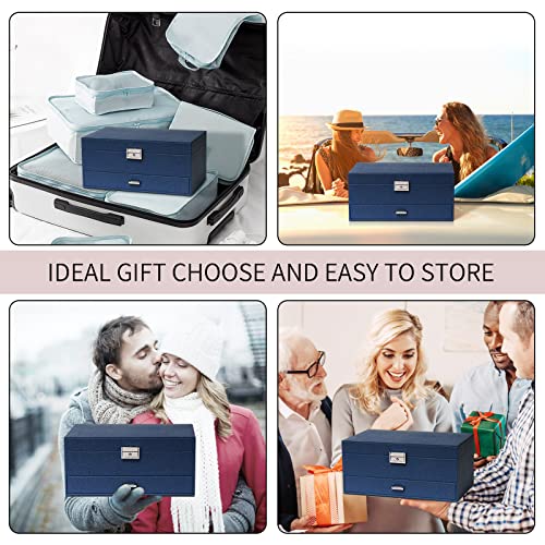 FEIYAN - صندوق منظم مجوهرات مع درج وقفل من اف اي واي ان حافظة طبقتين بطانة قطيفة للحلقان والسلاسل والخواتم محمول للنساء والرجال أزرق