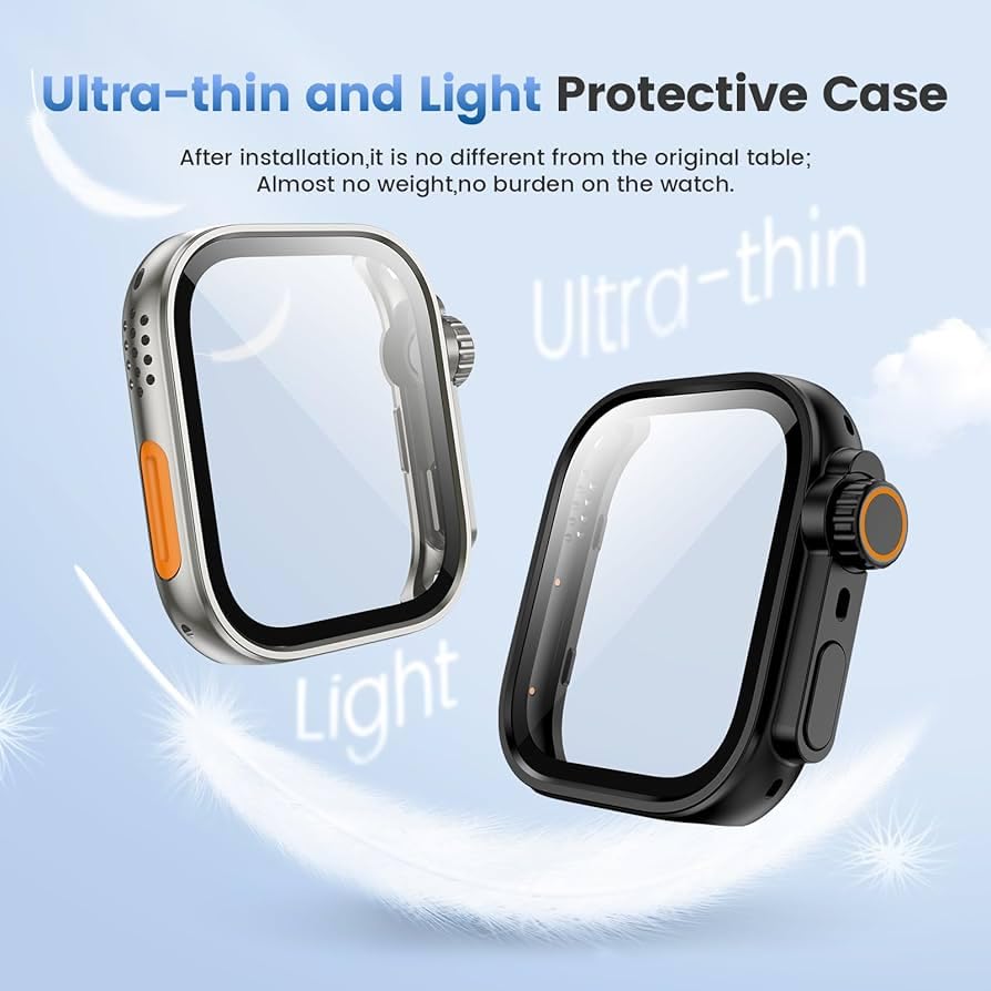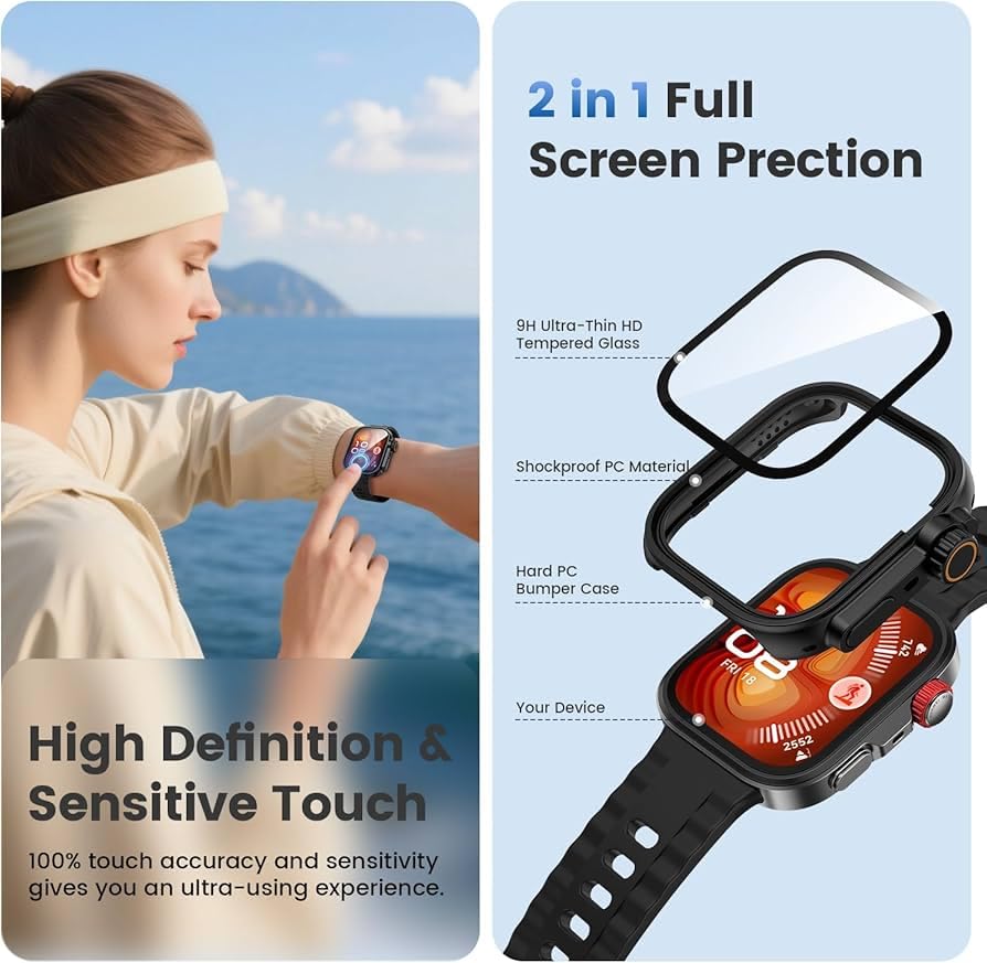 - 【يرجى ملاحظة】يغطي الجراب الشاشة والحواف بشكل شامل، مما يحمي ساعتك من الغبار وبصمات الأصابع والخدوش. في حالة التعرض للماء (السباحة والرياضات وما إلى ذلك)، يمكن استخدامه بشكل عادي فقط عن طريق تجفيفه بالمسح بقطعة قماش.