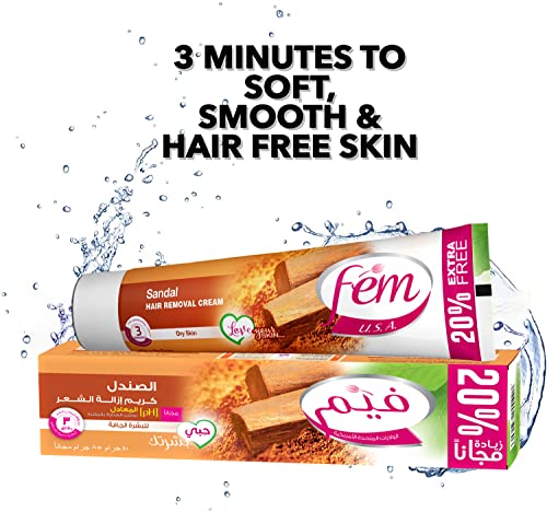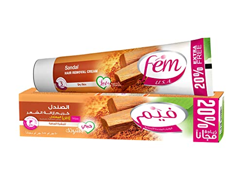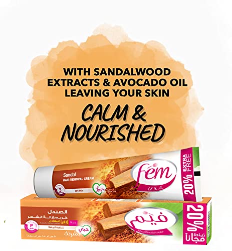 FEM - كريم ازالة الشعر يو اس ايه من فيم من مستخلصات خشب الصندل وزيت الافوكادو يترك بشرتك هادئة ومغذية مناسب للبشرة الجافة - 40 جرام + 20% اضافي