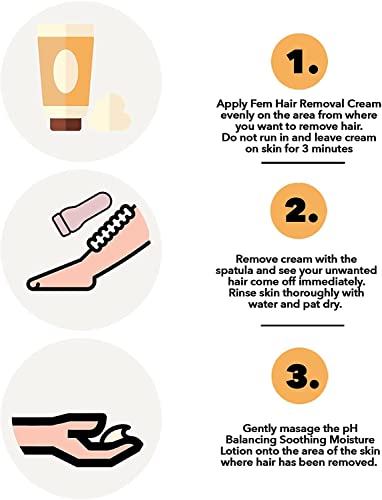 - تعليمات الاستخدام: 1) ضعي كريم إزالة الشعر فيم بالتساوي على المنطقة التي تريدين إزالة الشعر منها. لا تتركي الكريم على بشرتك لمدة 3 دقائق. 2) أزيلي الكريم باستخدام الملعقة وشاهدي شعرك غير المرغوب فيه ينزع على الفور. اشطفي البشرة جيدًا بالماء واتركيها لتجف. 3) دلكي لوشن توازن درجة الحموضة بلطف على منطقة الجلد التي تمت إزالة الشعر منها.